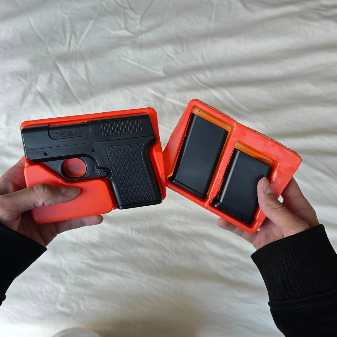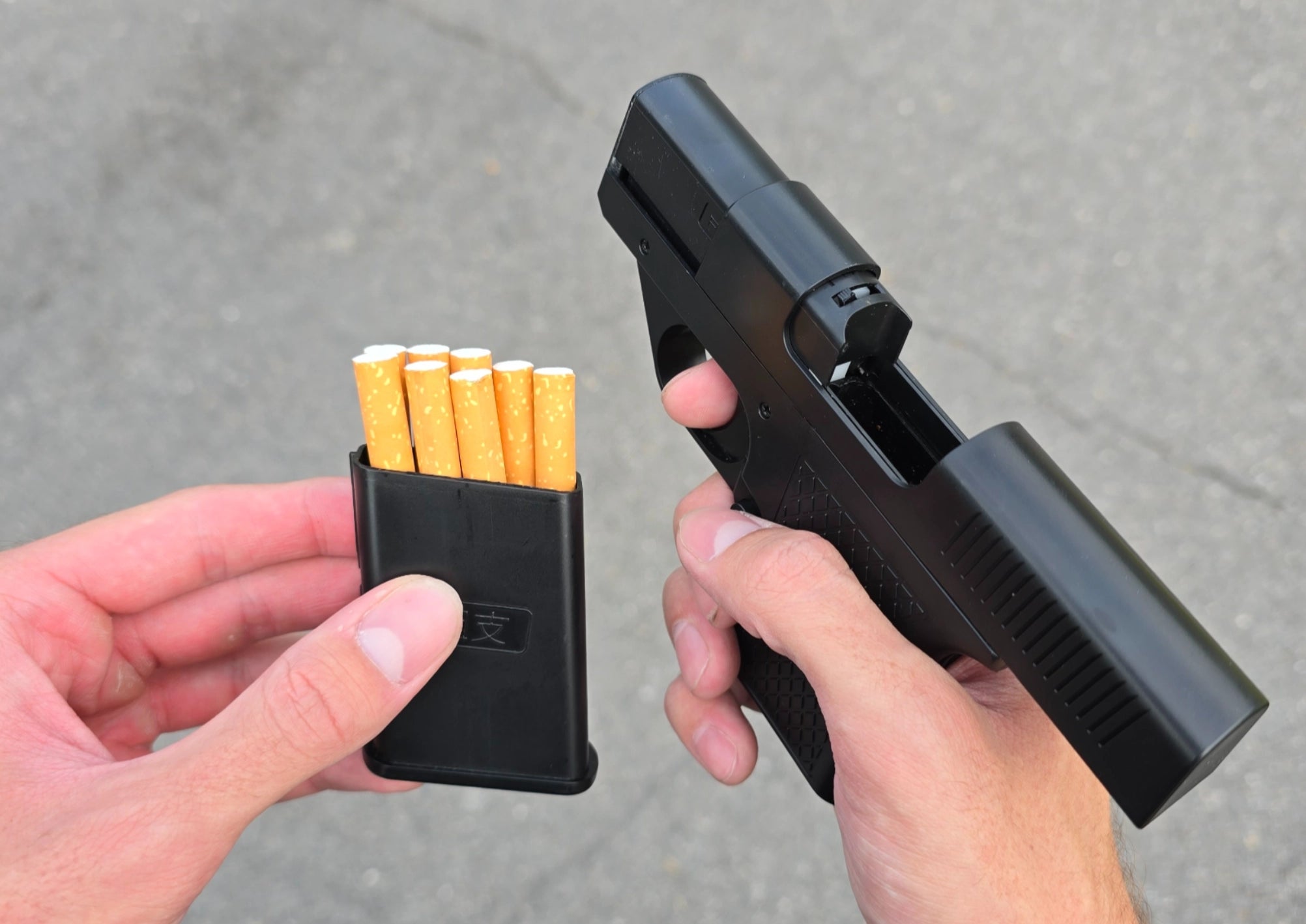 SmokeShot stocke vos cigarettes dans un chargeur amovible . Il suffit de retirer le chargeur, de prendre une cigarette, puis de le remettre en place. Placez la cigarette dans le porte-cigarette et appuyez sur la gâchette pour allumer la flamme .