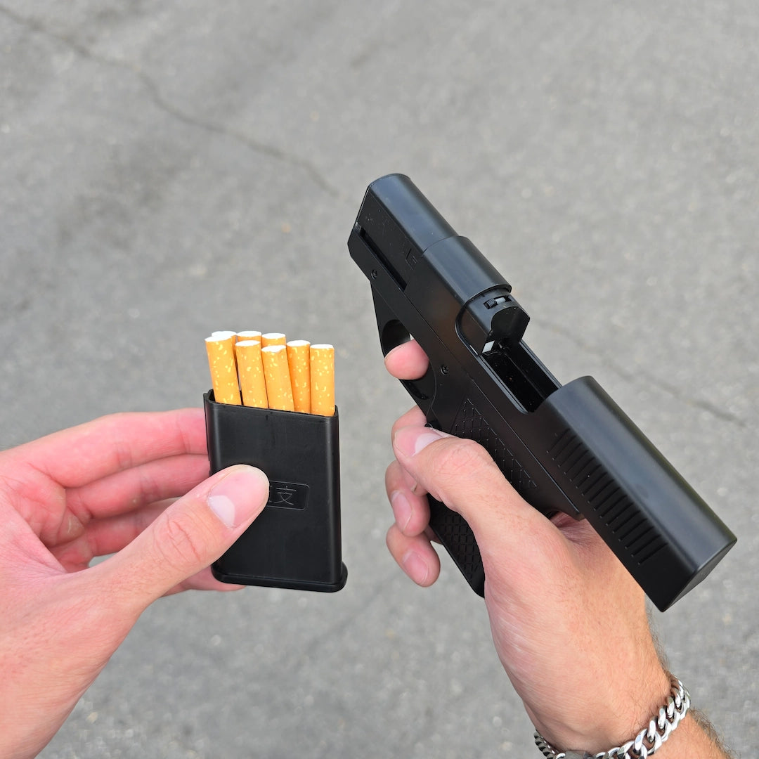 SmokeShot stocke vos cigarettes dans un chargeur amovible . Il suffit de retirer le chargeur, de prendre une cigarette, puis de le remettre en place. Placez la cigarette dans le porte-cigarette et appuyez sur la gâchette pour allumer la flamme .