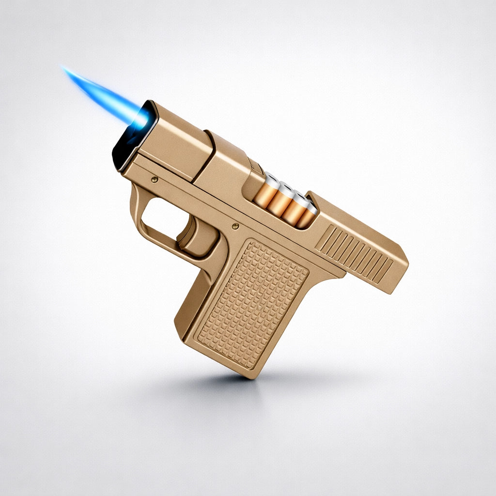 SmokeShot est un briquet à flamme jet rechargeable, conçu comme un pistolet miniature. Il est également doté d'un porte-cigarette intégré et d'un chargeur amovible permettant de ranger discrètement ses cigarettes. C'est à la fois un briquet fonctionnel et un objet original pour engager la conversation .